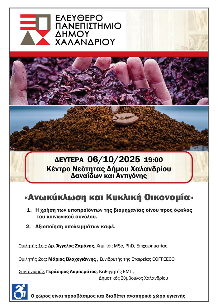 Το Ελεύθερο Πανεπιστήμιο του Δήμου Χαλανδρίου φιλοξενεί την εναρκτήρια εκδήλωσή του για τη νέα περίοδο με θέμα: «Ανωκύκλωση και Κυκλική Οικονομία», τη Δευτέρα 6 Οκτωβρίου 2025 και ώρα 19:00, στο Κέντρο Νεότητας (Δαναΐδων & Αντιγόνης).