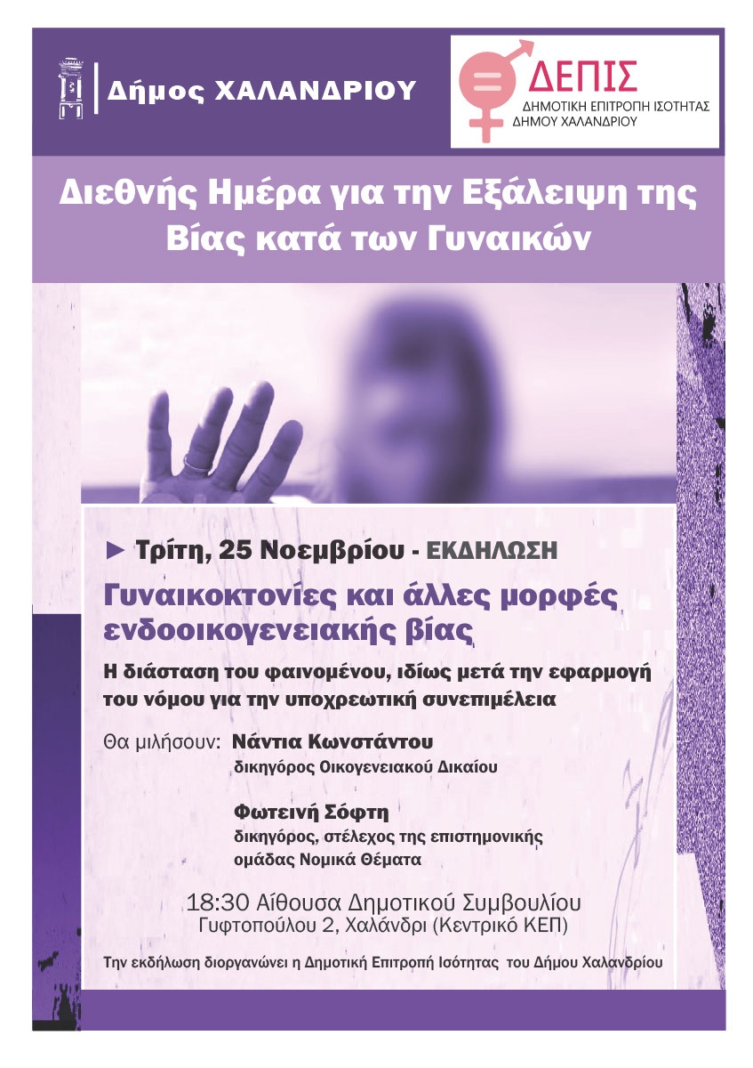Mε αφορμή τη Διεθνή Ημέρα για την Εξάλειψη της Βίας κατά των Γυναικών, η Δημοτική Επιτροπή Ισότητας του Δήμου Χαλανδρίου (ΔΕΠΙΣ) διοργανώνει την εκδήλωση «Γυναικοκτονίες και άλλες μορφές ενδοοικογενειακής βίας», την Τρίτη 25 Νοεμβρίου 2025, στην αίθουσα του Δημοτικού Συμβουλίου (Γυφτοπούλου 2), στις 18:30.