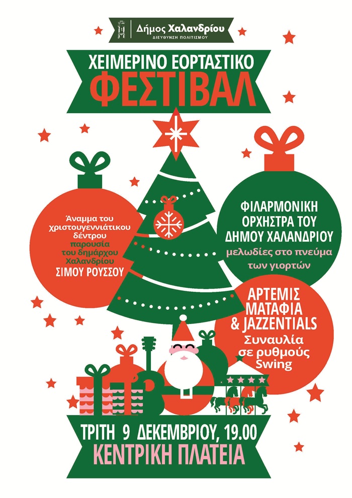 Με το άναμμα του χριστουγεννιάτικου δέντρου στην Κεντρική Πλατεία, παρουσία του δημάρχου Χαλανδρίου Σίμου Ρούσσου, την Τρίτη 9 Δεκεμβρίου 2025, στις 7:00 το απόγευμα, ανοίγει το Χειμερινό εορταστικό Φεστιβάλ 2025 του Δήμου.
