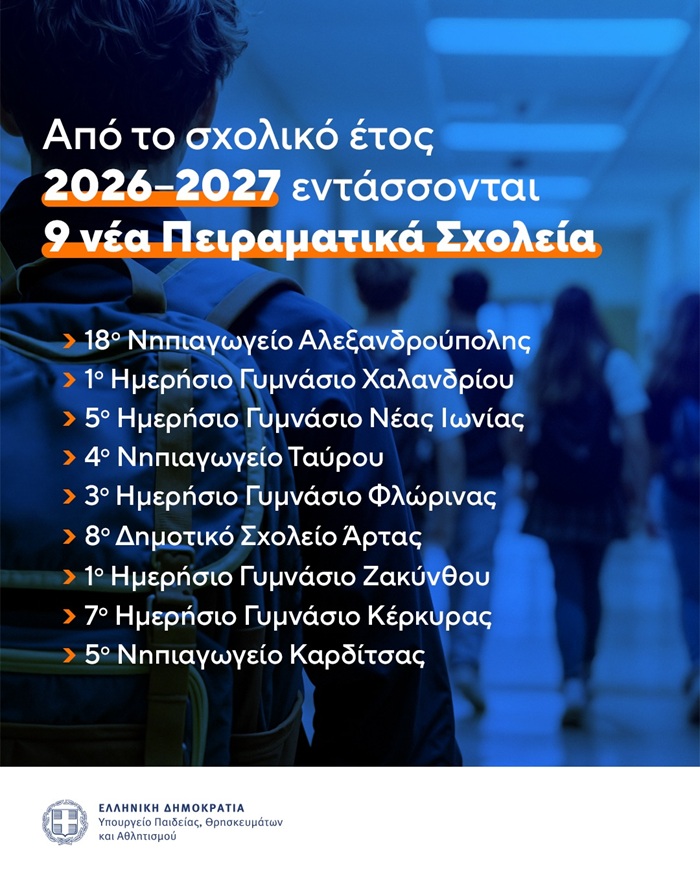 Με απόφαση της υπουργού Παιδείας, Θρησκευμάτων και Αθλητισμού, Σοφίας Ζαχαράκη, 13 σχολεία χαρακτηρίζονται ως Πειραματικά εκ των οποίων τα 9 θα λειτουργήσουν από το σχολικό έτος 2026-2027 και τα 4 από το σχολικό έτος 2027-2028, ενισχύοντας τον θεσμό των Πειραματικών Σχολείων με στόχο τη δημιουργία σύγχρονων εκπαιδευτικών δομών, ικανών να ανταποκριθούν στις αυξημένες απαιτήσεις της εποχής και στις ανάγκες της νέας γενιάς.