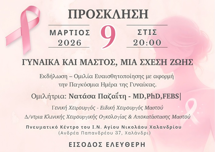 Η εκδήλωση “Γυναίκα και Μαστός, μια Σχέση Ζωής” θα πραγματοποιηθεί τη Δευτέρα 9 Μαρτίου 2026, στις 20:00, στο Πνευματικό Κέντρο του Ι.Ν. Αγίου Νικολάου Χαλανδρίου (Ανδρέα Παπανδρέου 37, Χαλάνδρι), με ελεύθερη είσοδο για το κοινό.