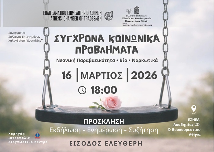 Ο Σύλλογος Επιστημόνων Χαλανδρίου «Ευριπίδης», σε συνεργασία με το Επαγγελματικό Επιμελητήριο Αθηνών και το Εργαστήριο Ιατροδικαστικής και Τοξικολογίας του Εθνικού και Καποδιστριακού Πανεπιστημίου Αθηνών, διοργανώνει εκδήλωση - ομιλία με θέμα «Σύγχρονα Κοινωνικά Προβλήματα – Νεανική Παραβατικότητα, Βία, Ναρκωτικά», τη Δευτέρα 16 Μαρτίου 2026, στις 18:00, στην αίθουσα της Ε.Σ.Η.Ε.Α. (Ακαδημίας 20 & Βουκουρεστίου, Αθήνα). Η είσοδος είναι ελεύθερη.