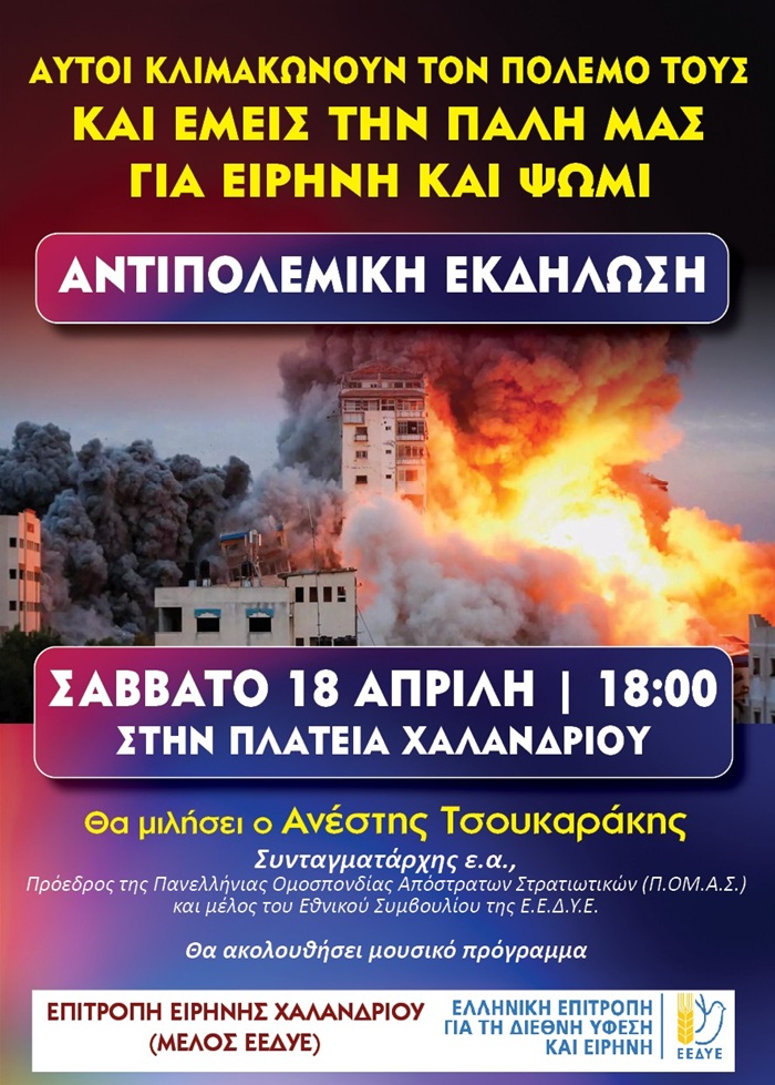 Η Επιτροπή Ειρήνης Χαλανδρίου διοργανώνει αντιπολεμική εκδήλωση το Σάββατο 18 Απρίλη στις 6μμ στην πλατεία Χαλανδρίου.