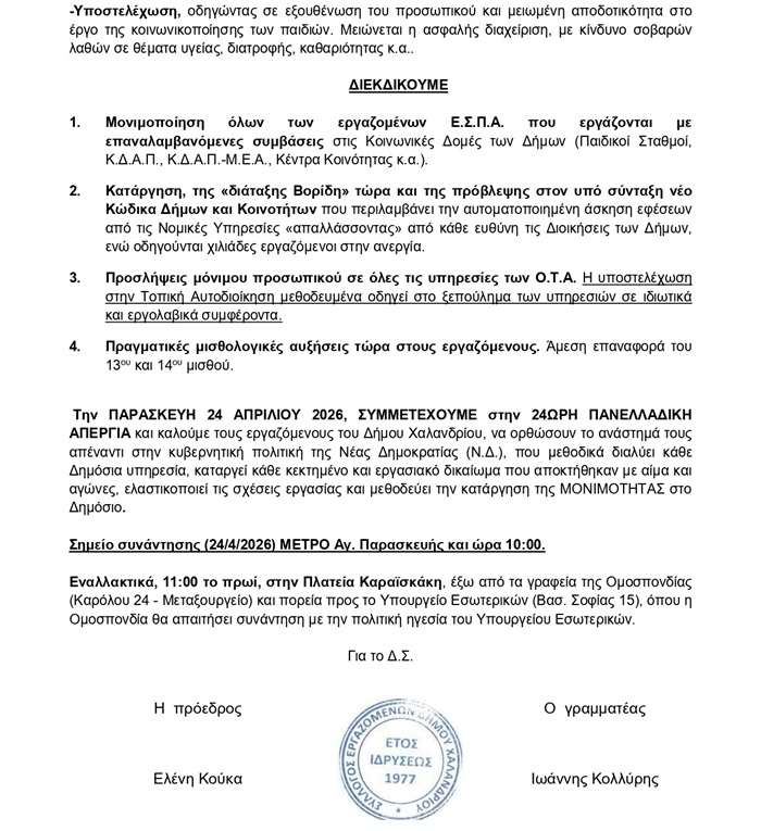 Aνακοίνωση και ψήφισμα του Συλλόγου Εργαζομένων Δήμου Χαλανδρίου