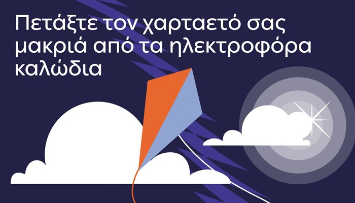 Ο Διαχειριστής Ελληνικού Δικτύου Διανομής Ηλεκτρικής Ενέργειας (ΔΕΔΔΗΕ), σας συμβουλεύει να μην πετάτε τον χαρταετό σας κοντά σε ηλεκτροφόρα καλώδια, καθώς υπάρχει σοβαρός κίνδυνος ηλεκτροπληξίας για εσάς και διακοπής της παροχής ρεύματος στη γύρω περιοχή.