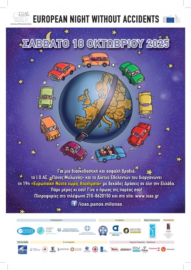 Το Ινστιτούτο Οδικής Ασφάλειας (Ι.Ο.ΑΣ.) «Πάνος Μυλωνάς» διοργανώνει για 19η συνεχή χρονιά τη μεγάλη πανελλαδική δράση ευαισθητοποίησης «Ευρωπαϊκή Νύχτα χωρίς Ατυχήματα», το Σάββατο 18 Οκτωβρίου 2025 σε δεκάδες πόλεις σε όλη την Ελλάδα, με τη συμμετοχή εκατοντάδων εθελοντών του Δικτύου του.