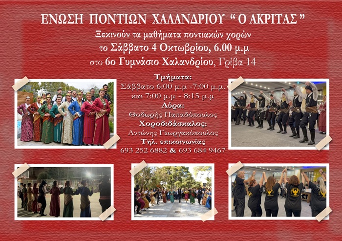 Ξεκινούν τα μαθήματα της Ένωσης Ποντίων Χαλανδρίου “Ο Ακρίτας” το Σάββατο 4 Οκτωβρίου 2025.