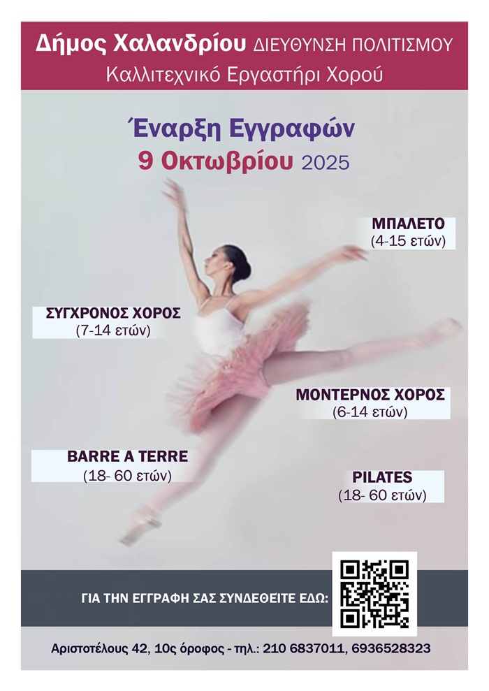 Από την Πέμπτη 9 Οκτωβρίου 2025 ξεκινούν οι ηλεκτρονικές αιτήσεις εγγραφής στην πλατφόρμα https://demos365.chalandri.gr/, για τα μαθήματα του Εργαστηρίου Χορού του Δήμου Χαλανδρίου.