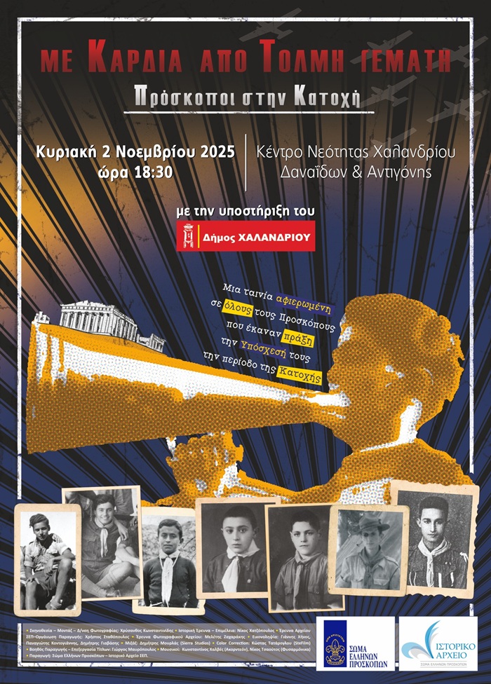Η προβολή του ντοκιμαντέρ «Με Καρδιά από Τόλμη Γεμάτη - Πρόσκοποι στην Κατοχή» θα πραγματοποιηθεί την Κυριακή 2 Νοεμβρίου 2025 και ώρα 18:30, στο Κέντρο Νεότητας Χαλανδρίου. Η ταινία είναι αφιερωμένη σε όλους τους Προσκόπους που έκαναν πράξη την υπόσχεσή τους την περίοδο της Κατοχής.