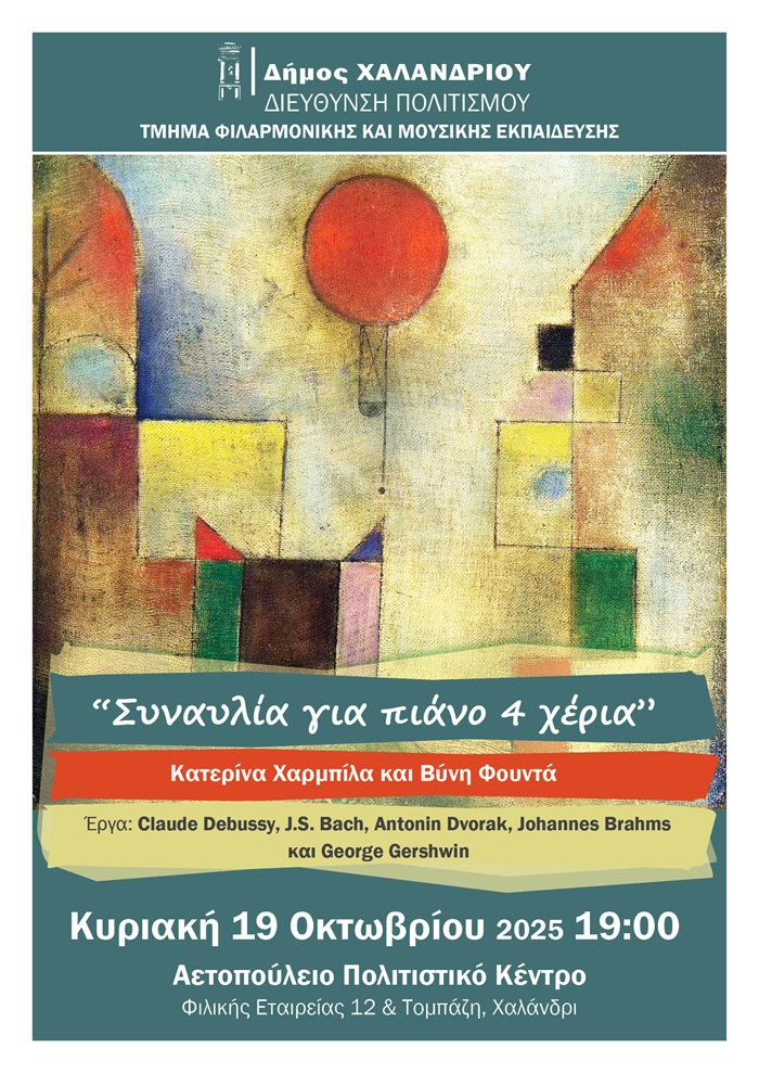 Οι μουσικοί του Εργαστηρίου Μουσικής Εκπαίδευσης της Φιλαρμονικής Ορχήστρας του Δήμου Χαλανδρίου οργανώνουν και φέτος τον κύκλο συναυλιών «Μουσική Κυριακή στο Αετοπούλειο», παρουσιάζοντας μουσική για πιάνο, εμπλουτισμένη με ηχοχρώματα πνευστών και έγχορδων οργάνων.