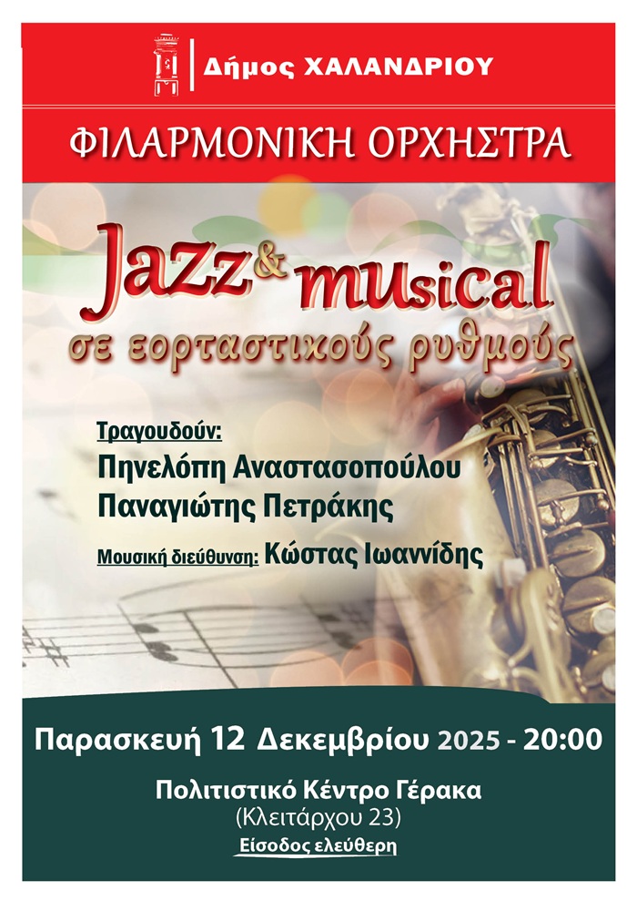 Η Φιλαρμονική Ορχήστρα του Δήμου Χαλανδρίου σας προσκαλεί σε μια μοναδική μουσική βραδιά σε jazz & musical ρυθμούς, την Παρασκευή 12 Δεκεμβρίου 2025, στις 20:00, στο Πολιτιστικό Κέντρο Γέρακα (Κλειτάρχου 23).