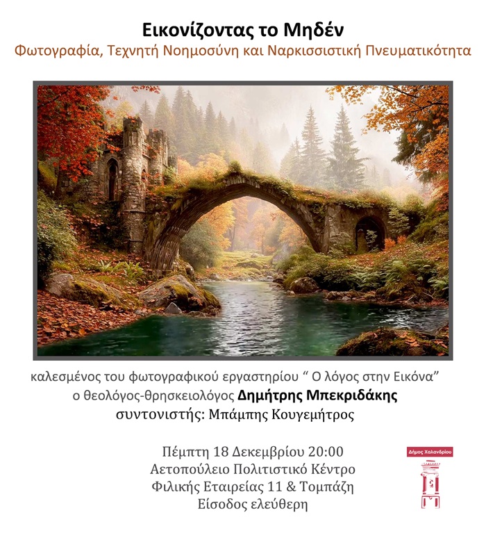 Το φωτογραφικό εργαστήριο «Ο λόγος στην Εικόνα» του Δήμου Χαλανδρίου διοργανώνει την εκδήλωση «Εικονίζοντας το Μηδέν – Φωτογραφία, Τεχνητή Νοημοσύνη και Ναρκισσιστική Πνευματικότητα», την Πέμπτη 18 Δεκεμβρίου 2025 και ώρα 20:00, στο Αετοπούλειο Πολιτιστικό Κέντρο (Φιλικής Εταιρείας 11 & Τομπάζη, Χαλάνδρι).