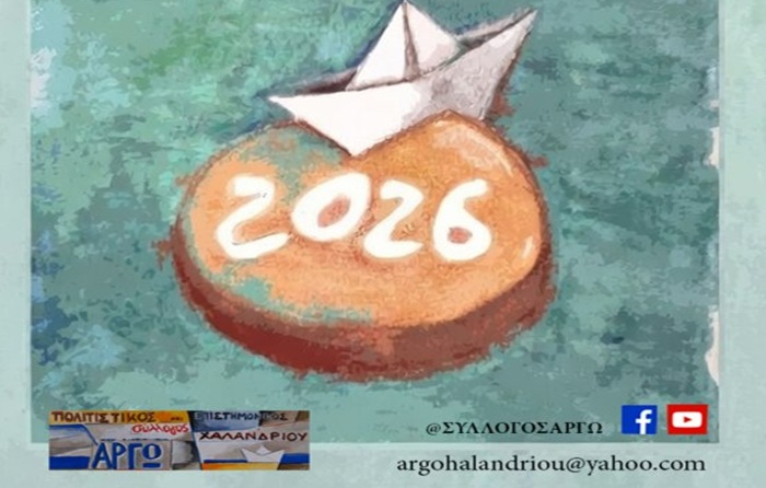 O Πολιτιστικός - Επιστημονικός Σύλλογος Χαλανδρίου ΑΡΓΩ κόβει την Πρωτοχρονιάτικη Πίτα του 2026 και σας προσκαλεί την Κυριακή 7 Φεβρουαρίου και ώρα 18:30, στην αίθουσα εκδηλώσεων του Δήμου Χαλανδρίου (Στρατάρχου Παπάγου 7, Χαλάνδρι - 2ος όροφος),