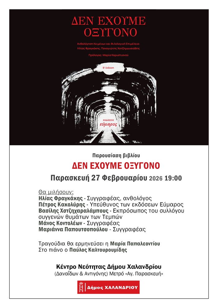 Το βιβλίο «Δεν έχουμε οξυγόνο» των εκδόσεων Εύμαρος παρουσιάζει ο Δήμος Χαλανδρίου την Παρασκευή 27 Φεβρουαρίου 2026, με αφορμή τη «μαύρη» επέτειο (28/2) του σιδηροδρομικού δυστυχήματος στα Τέμπη, στις 19:00, στο Κέντρο Νεότητας (Δαναΐδων & Αντιγόνης).