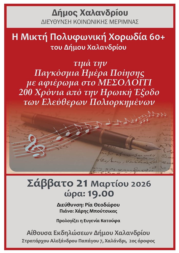 Η Μικτή Πολυφωνική Χορωδία 60+ του Δήμου Χαλανδρίου τιμά την Παγκόσμια Ημέρα Ποίησης με μια ξεχωριστή μουσικοποιητική εκδήλωση, η οποία αφιερώνεται στο Μεσολόγγι και τη συμπλήρωση 200 χρόνων από την Ηρωική Έξοδο των Ελεύθερων Πολιορκημένων.