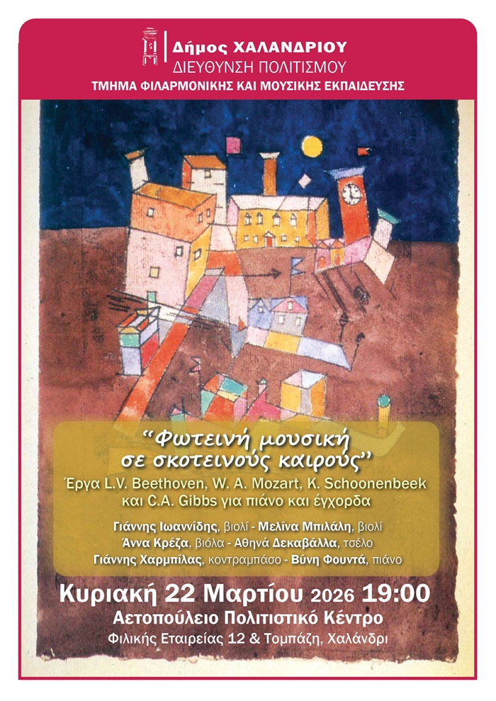 «Φωτεινή Μουσική σε σκοτεινούς καιρούς» είναι η επόμενη συναυλία του κύκλου «Μουσική Κυριακή στο Αετοπούλειο», που θα πραγματοποιηθεί στις 22 Μαρτίου 2026, στο Αετοπούλειο Πολιτιστικό Κέντρο (Φιλικής Εταιρείας 12 & Τομπάζη, Xαλάνδρι), στις 19:00.