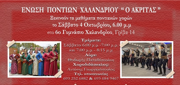 Ξεκινούν τα μαθήματα της Ένωσης Ποντίων Χαλανδρίου “Ο Ακρίτας” το Σάββατο 4 Οκτωβρίου 2025.