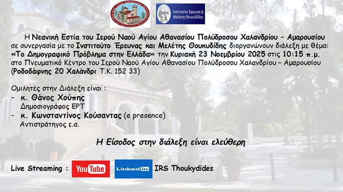 Η Νεανική Εστία του Ιερού Ναού Αγίου Αθανασίου Πολύδροσου Χαλανδρίου - Αμαρουσίου σε συνεργασία με το Ινστιτούτο Έρευνας και Μελέτης “Θουκυδίδης” διοργανώνουν διάλεξη με θέμα: «Το Δημογραφικό Πρόβλημα στην Ελλάδα», την Κυριακή 23 Νοεμβρίου 2025 και ώρα 10:15 π.μ., στο Πνευματικό Κέντρο του Ιερού Ναού Αγίου Αθανασίου Πολύδροσου Χαλανδρίου - Αμαρουσίου (Ροδοδάφνης 20, Χαλάνδρι Τ.Κ. 152 33).