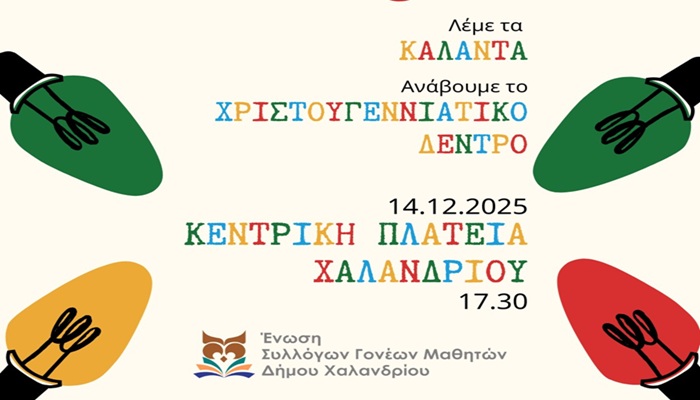 Ένωση Γονέων Χαλανδρίου: «Λέμε τα κάλαντα – Ανάβουμε το χριστουγεννιάτικο δέντρο» 11-12-25 ΕΙΔΗΣΕΙΣ Η Ένωση Συλλόγων Γονέων Μαθητών Χαλανδρίου σας προσκαλεί σε μια χριστουγεννιάτικη δράση στην καρδιά της πόλης: Έρχεται η πιο γιορτινή στιγμή του Δεκέμβρη! Κυριακή 14 Δεκεμβρίου 2025 17:30 Κεντρική Πλατεία Χαλανδρίου Θα τραγουδήσουμε τα κάλαντα παρέα με τα παιδιά των Δημοτικών Σχολείων. Θα στήσουμε και θα φωτίσουμε το πιο πολύχρωμο χριστουγεννιάτικο δέντρο της πόλης. Φορέστε το πιο ζεστό σας χαμόγελο, ελάτε με γιορτινή διάθεση και ετοιμαστείτε για μια βραδιά γεμάτη φως, μουσική, παιχνίδι και μαγεία!