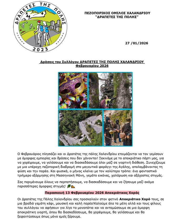 Οι “Δραπέτες της πόλης Χαλανδρίου” ανακοινώνουν τις δράσεις τους για τον μήνα Φεβρουάριο 2026: