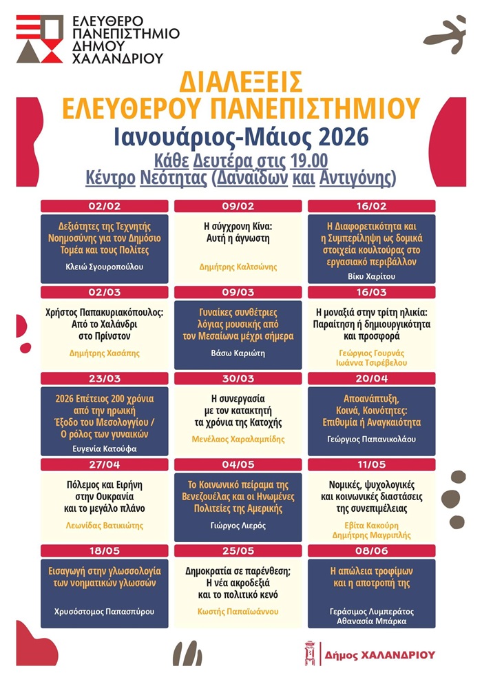 Tο Ελεύθερο Πανεπιστήμιο του Δήμου Χαλανδρίου φιλοξενεί μια πολύ ενδιαφέρουσα εκδήλωση (η οποία ανοίγει την εαρινή περίοδο) με θέμα: «Δεξιότητες Τεχνητής Νοημοσύνης για τον Δημόσιο Τομέα και τους Πολίτες», τη Δευτέρα 2 Φεβρουαρίου 2026 και ώρα 19:00, στο Κέντρο Νεότητας (Δαναΐδων & Αντιγόνης, Χαλάνδρι).