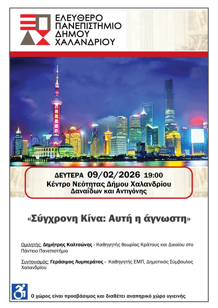 Το Ελεύθερο Πανεπιστήμιο του Δήμου Χαλανδρίου φιλοξενεί μια πολύ επίκαιρη όσο και ενδιαφέρουσα εκδήλωση με θέμα: «Η σύγχρονη Κίνα: Αυτή η άγνωστη», τη Δευτέρα 9 Φεβρουαρίου 2026 και ώρα 19:00, στο Κέντρο Νεότητας (Δαναΐδων & Αντιγόνης, Χαλάνδρι).