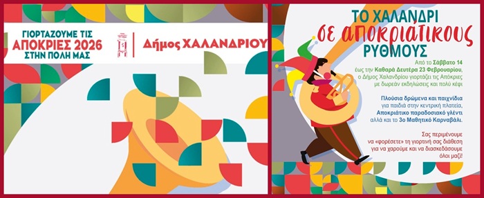 Με δωρεάν εκδηλώσεις για όλους και πολύ κέφι, ο Δήμος Χαλανδρίου γιορτάζει και φέτος τις Απόκριες και προσκαλεί κατοίκους και επισκέπτες σε ένα γιορτινό ταξίδι γεμάτο χαρά, κέφι, παράδοση και δημιουργία, με επίκεντρο την Κεντρική Πλατεία.
