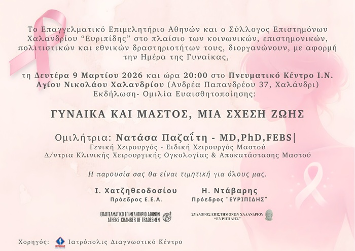 Η εκδήλωση “Γυναίκα και Μαστός, μια Σχέση Ζωής” θα πραγματοποιηθεί τη Δευτέρα 9 Μαρτίου 2026, στις 20:00, στο Πνευματικό Κέντρο του Ι.Ν. Αγίου Νικολάου Χαλανδρίου (Ανδρέα Παπανδρέου 37, Χαλάνδρι), με ελεύθερη είσοδο για το κοινό.