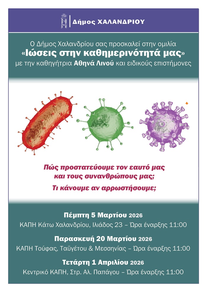 Το επίκαιρο θέμα «Ιώσεις στην καθημερινότητά μας» παρουσιάζεται στα ΚΑΠΗ του Δήμου Χαλανδρίου, με ομιλίες που θα πραγματοποιήσει η καθηγήτρια Αθηνά Λινού και ομάδα ειδικών επιστημόνων.