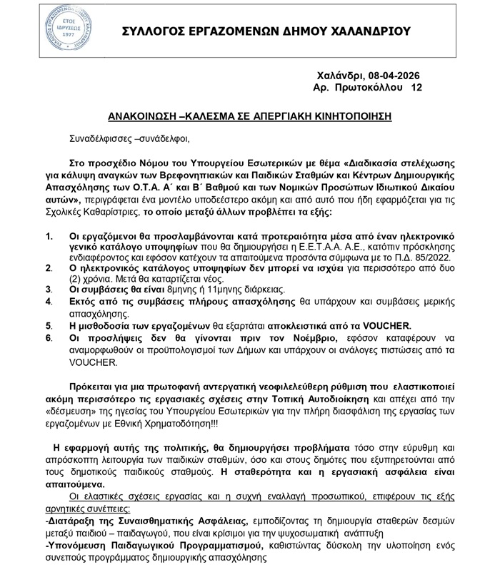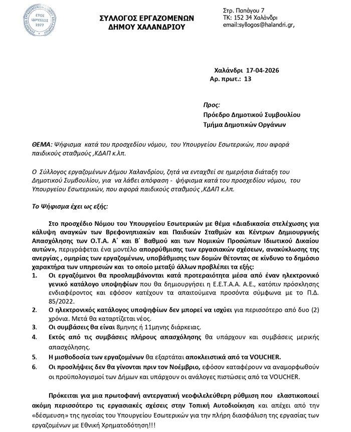 Ανακοίνωση του Συλλόγου Εργαζομένων Δήμου Χαλανδρίου καθώς και ψήφισμα που αφορά στο προσχέδιο Νόμου του Υπουργείου Εσωτερικών, για παιδικούς σταθμούς, Κ.Δ.Α.Π. κ.λπ.: