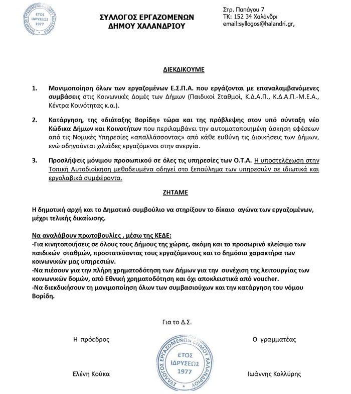 Aνακοίνωση και ψήφισμα του Συλλόγου Εργαζομένων Δήμου Χαλανδρίου