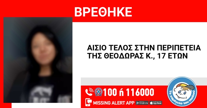 Αίσιο τέλος στην περιπέτεια της 17χρονης Θεοδώρας που είχε εξαφανιστεί από το Χαλάνδρι
