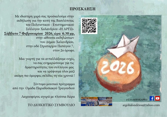 O Πολιτιστικός - Επιστημονικός Σύλλογος Χαλανδρίου ΑΡΓΩ κόβει την Πρωτοχρονιάτικη Πίτα του 2026 και σας προσκαλεί την Κυριακή 7 Φεβρουαρίου και ώρα 18:30, στην αίθουσα εκδηλώσεων του Δήμου Χαλανδρίου (Στρατάρχου Παπάγου 7, Χαλάνδρι - 2ος όροφος),