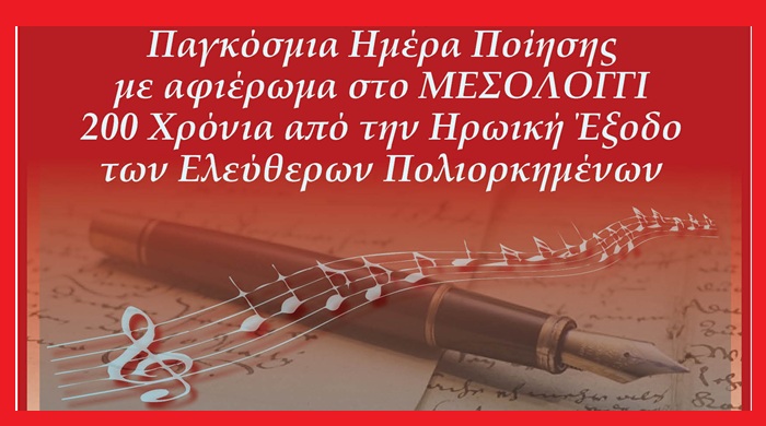 Η Μικτή Πολυφωνική Χορωδία 60+ του Δήμου Χαλανδρίου τιμά την Παγκόσμια Ημέρα Ποίησης με μια ξεχωριστή μουσικοποιητική εκδήλωση, η οποία αφιερώνεται στο Μεσολόγγι και τη συμπλήρωση 200 χρόνων από την Ηρωική Έξοδο των Ελεύθερων Πολιορκημένων.