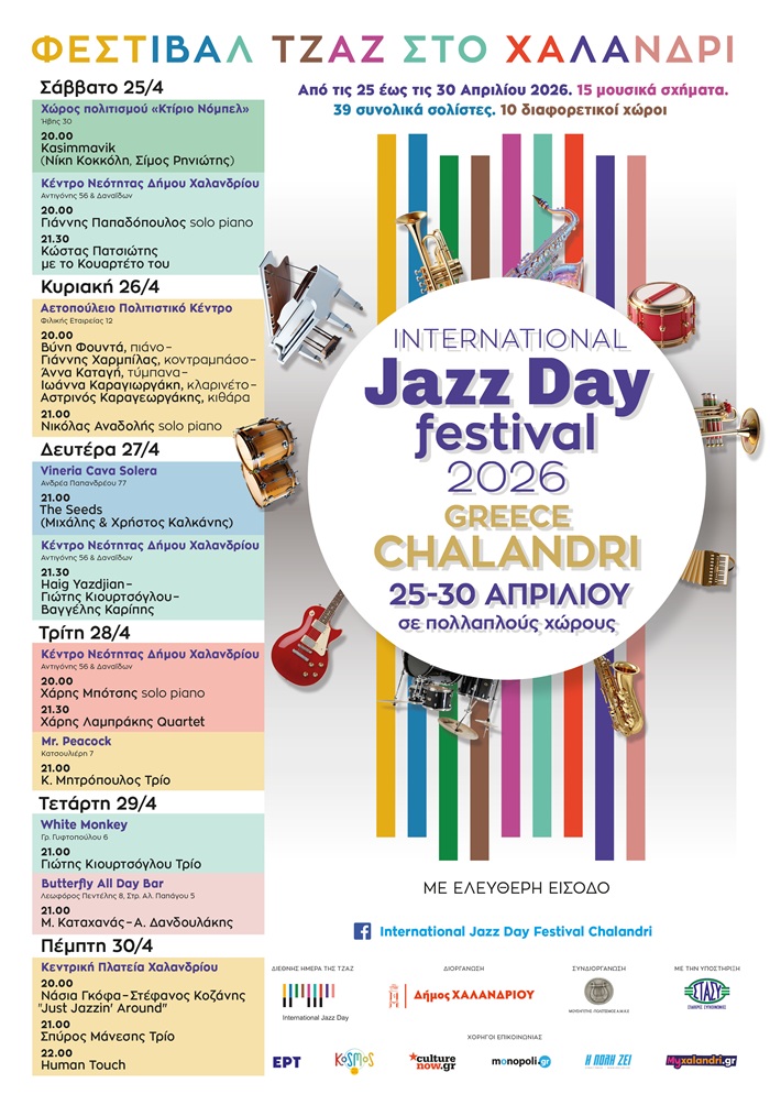 Ο Δήμος Χαλανδρίου διοργανώνει φέτος, για πρώτη φορά στην Ελλάδα, το International Jazz Day Festival Chalandri (25-30 Απριλίου 2026), με αφορμή την Παγκόσμια Ημέρα Τζαζ 2026, η οποία αποτελεί διεθνή πρωτοβουλία της UNESCO, εντάσσοντας τη χώρα μας στον χάρτη των 190+ χωρών που συμμετέχουν κάθε χρόνο στη γιορτή.