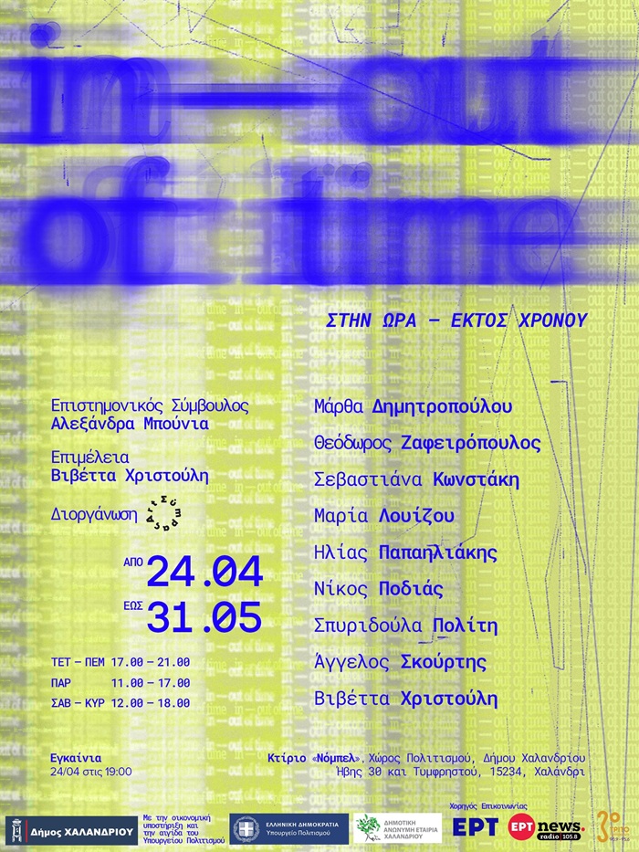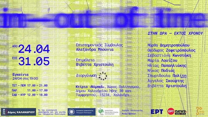 Την έκθεση σύγχρονης Τέχνης «In/Out of Time - Στην ώρα, εκτός χρόνου» θα φιλοξενήσει ο Χώρος Πολιτισμού - Κτίριο Νόμπελ, στο Χαλάνδρι, από 24 Απριλίου έως 31 Μαΐου 2026.