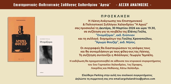 Η Λέσχη Ανάγνωσης του Πολιτιστικού - Επιστημονικού Συλλόγου Χαλανδρίου ΑΡΓΩ σας προσκαλεί τη Δευτέρα 30 Μαρτίου 2026 και ώρα 19:30, σε